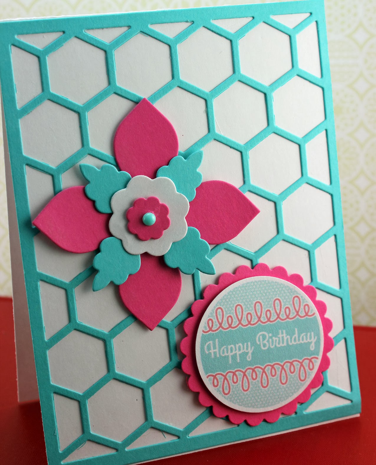 Lizzie produced a very pretty little birthday greeting. I used my Lovely Layers die cut. It was on my workspace! I don't use my cover plates enough so I used the Hexagon one.